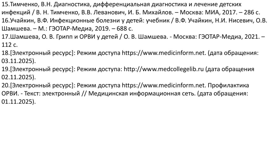 15.Тимченко, В.Н. Диагностика, дифференциальная диагностика и лечение детскихинфекций / В. Н. Тимченко, В.В. Леванович, И. Б. Михайлов. – Москва: МИА, 2017. – 286 с.