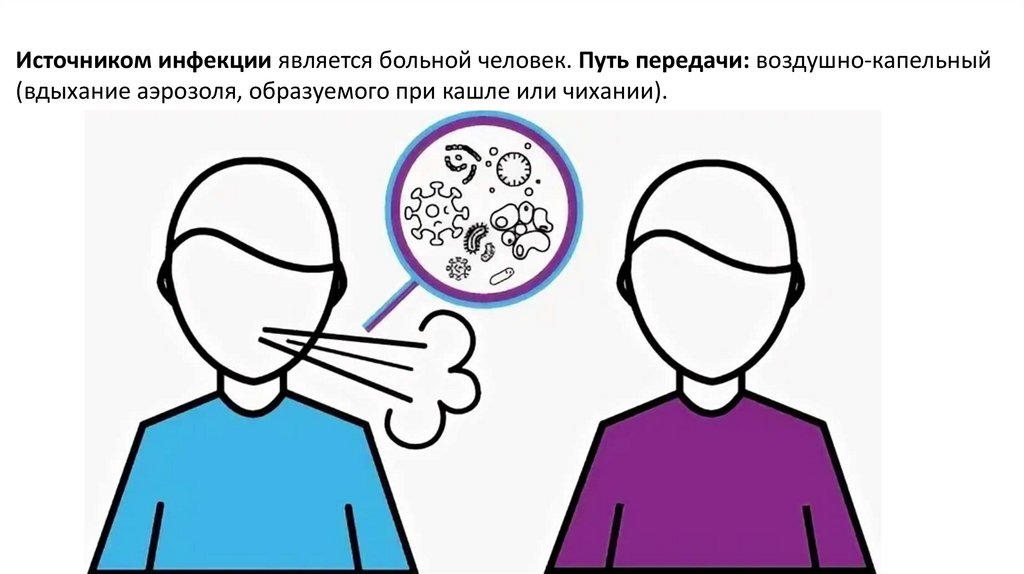 Источником инфекции является больной человек. Путь передачи: воздушно-капельный(вдыхание аэрозоля, образуемого при кашле или чихании).