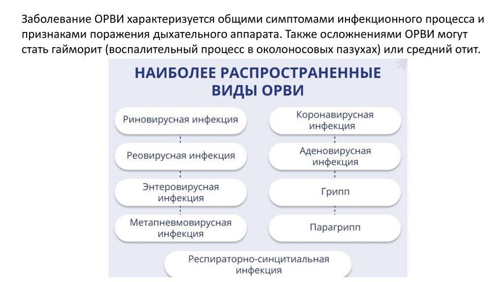 Заболевание ОРВИ характеризуется общими симптомами инфекционного процесса ипризнаками поражения дыхательного аппарата. Также осложнениями ОРВИ могут