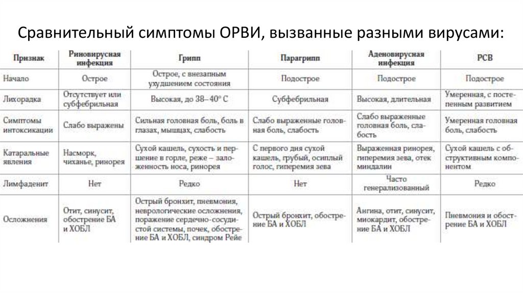 Сравнительный симптомы ОРВИ, вызванные разными вирусами:11.