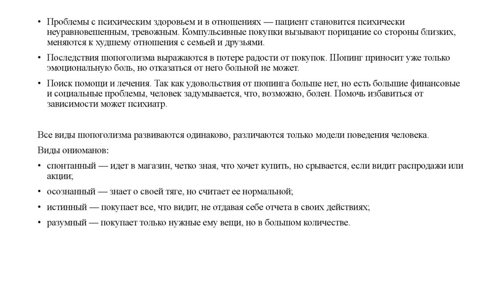 • Проблемы с психическим здоровьем и в отношениях — пациент становится психическинеуравновешенным, тревожным. Компульсивные покупки вызывают порицание со стороны близких,