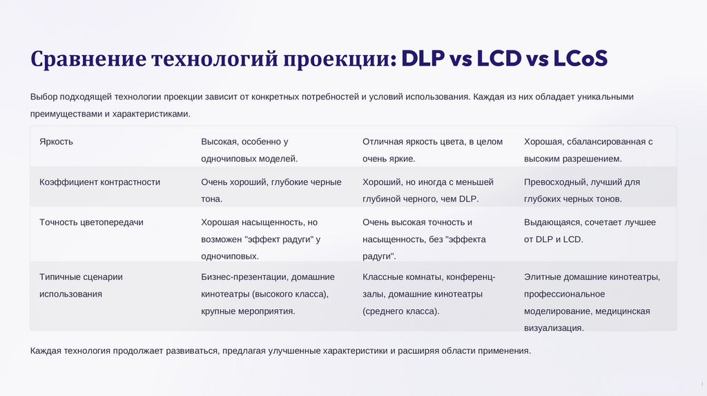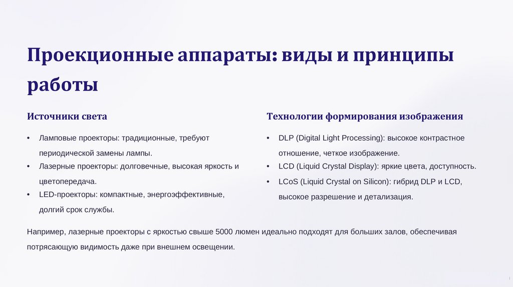 Например, лазерные проекторы с яркостью свыше 5000 люмен идеально подходят для больших залов, обеспечивая