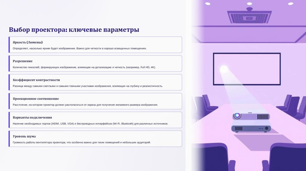Громкость работы вентилятора проектора, что особенно важно для тихих помещений и небольших аудиторий.