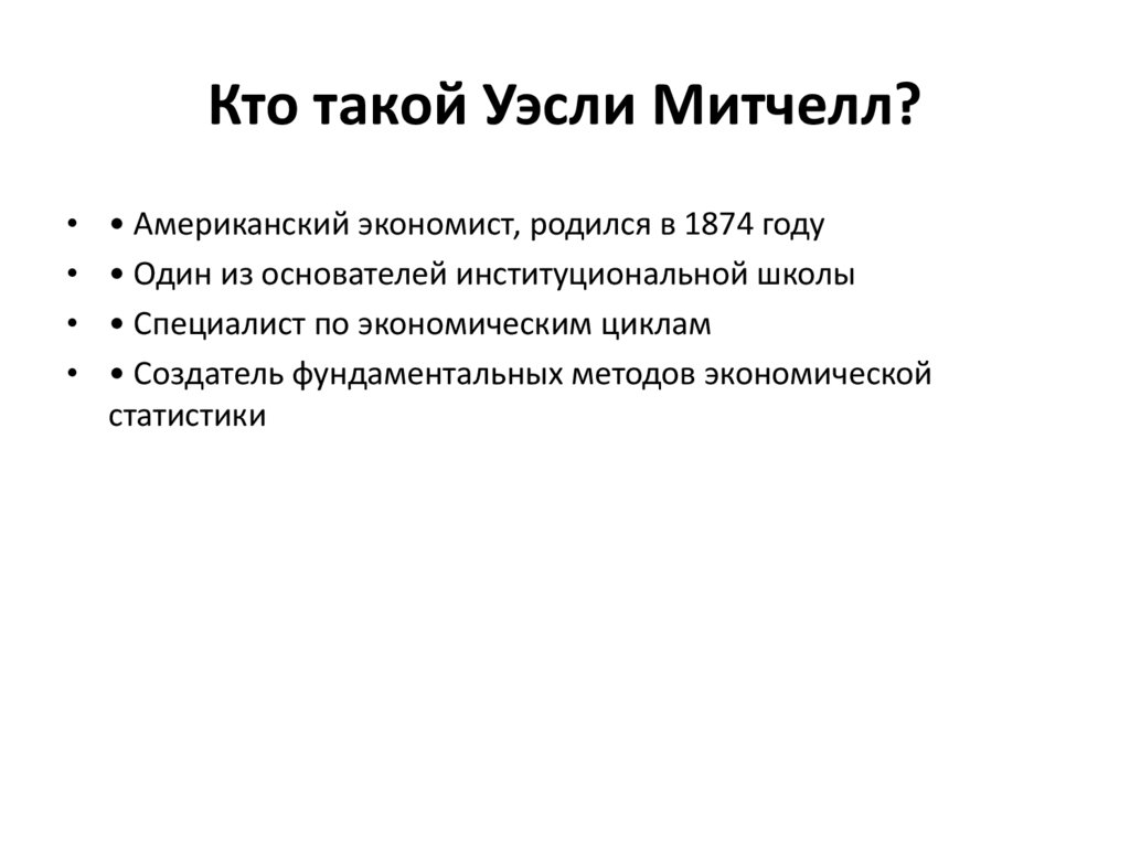 Кто такой Уэсли Митчелл?• Американский экономист, родился в 1874 году