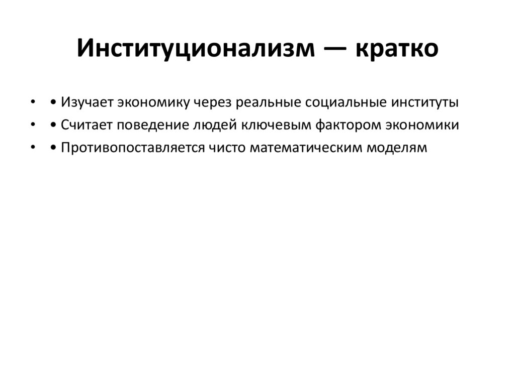 Институционализм — кратко• • Изучает экономику через реальные социальные институты