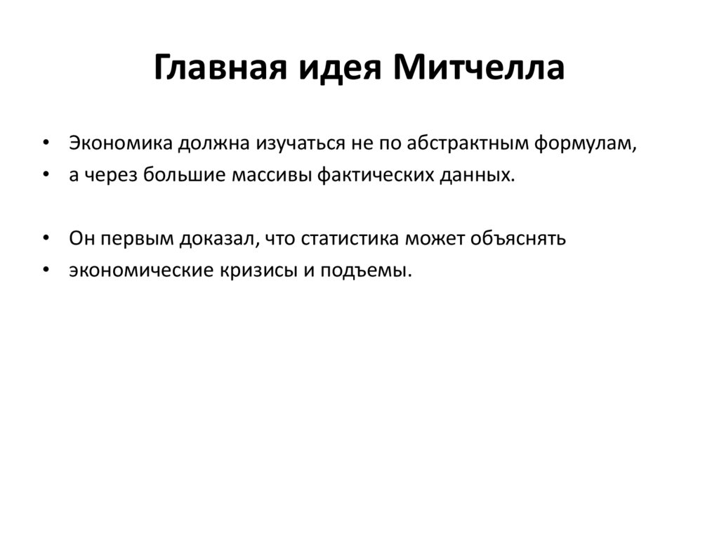 Главная идея Митчелла• Экономика должна изучаться не по абстрактным формулам,