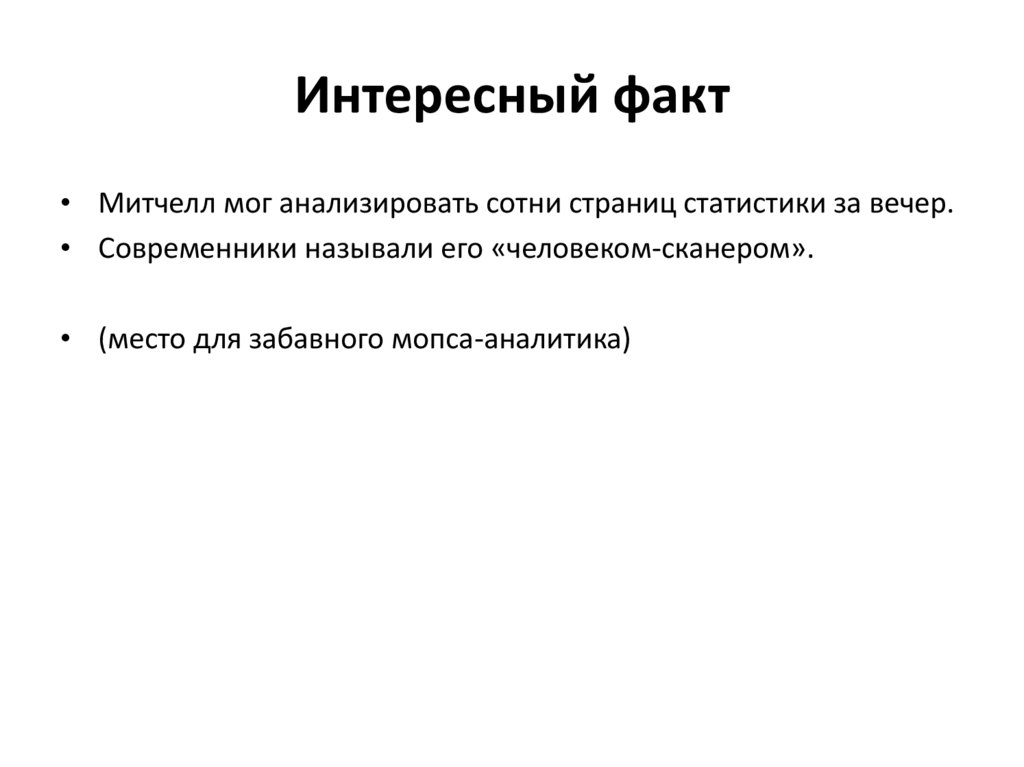 Интересный факт• Митчелл мог анализировать сотни страниц статистики за вечер.