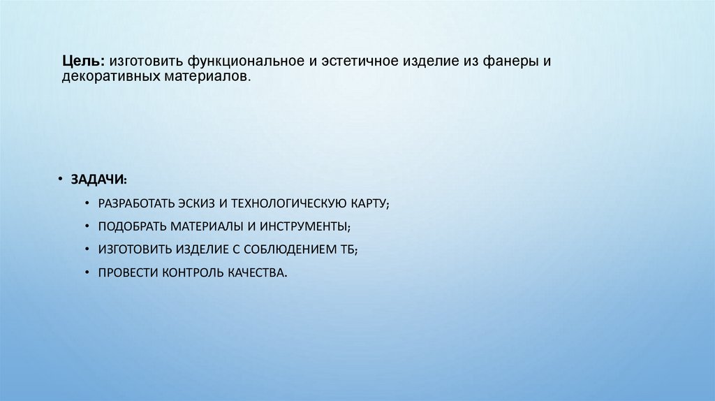 Цель: изготовить функциональное и эстетичное изделие из фанеры идекоративных материалов.