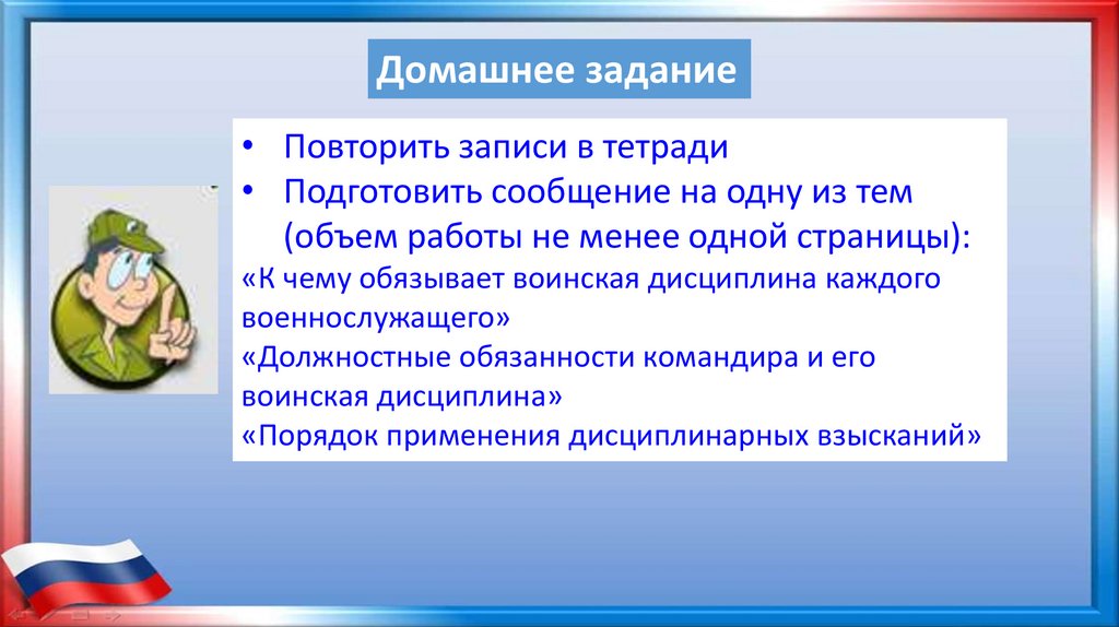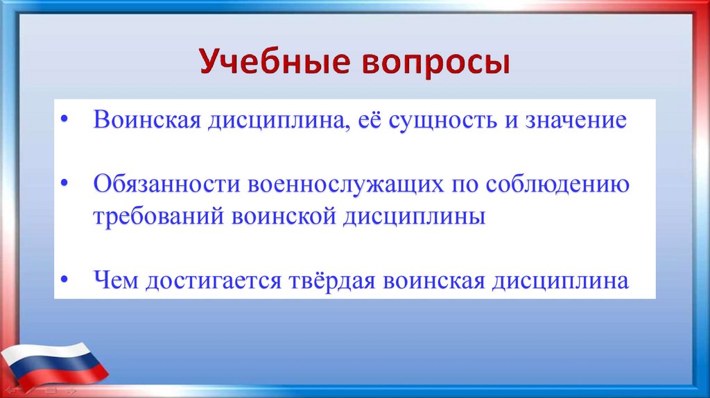 • Воинская дисциплина, её сущность и значение• Обязанности военнослужащих по соблюдению