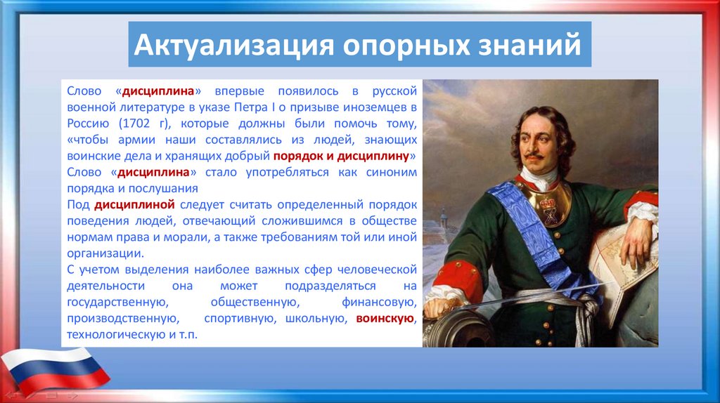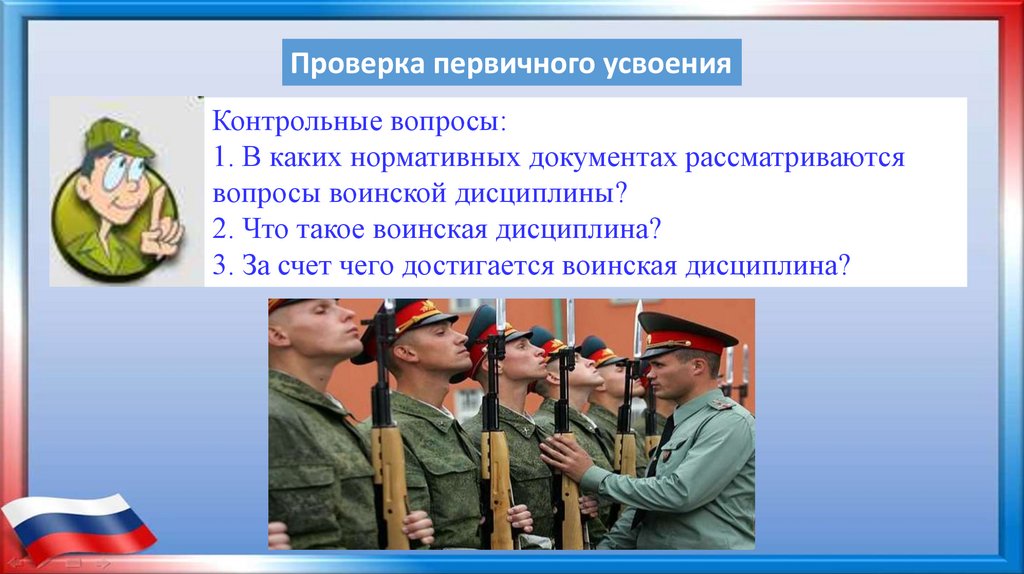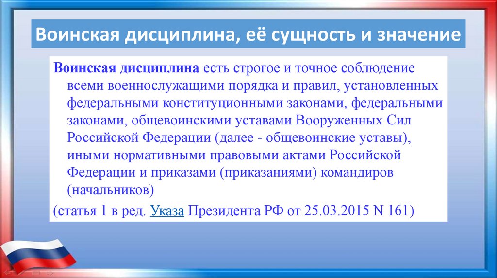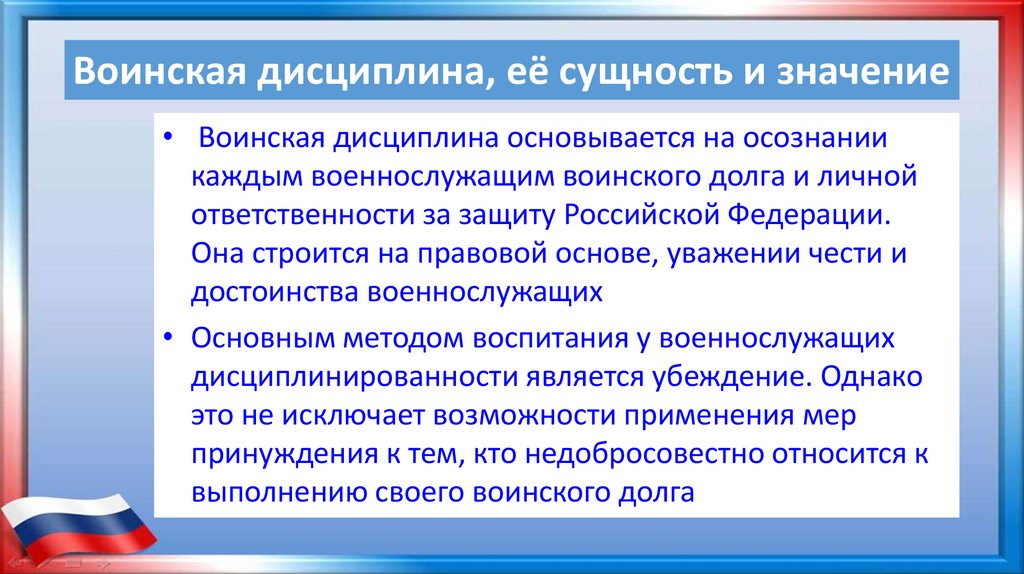 Воинская дисциплина, её сущность и значение• Воинская дисциплина основывается на осознании