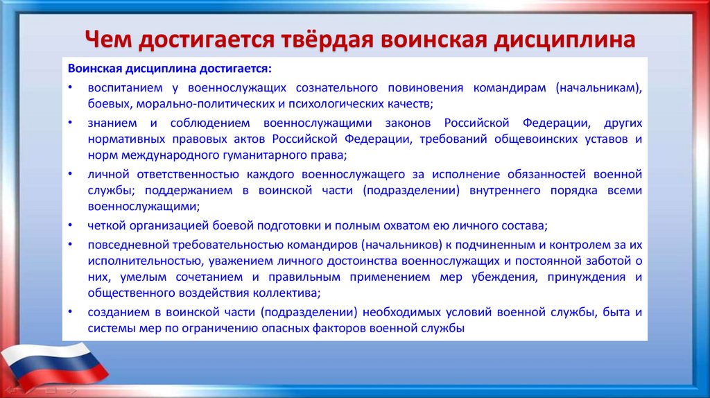 Чем достигается твёрдая воинская дисциплинаВоинская дисциплина достигается:
