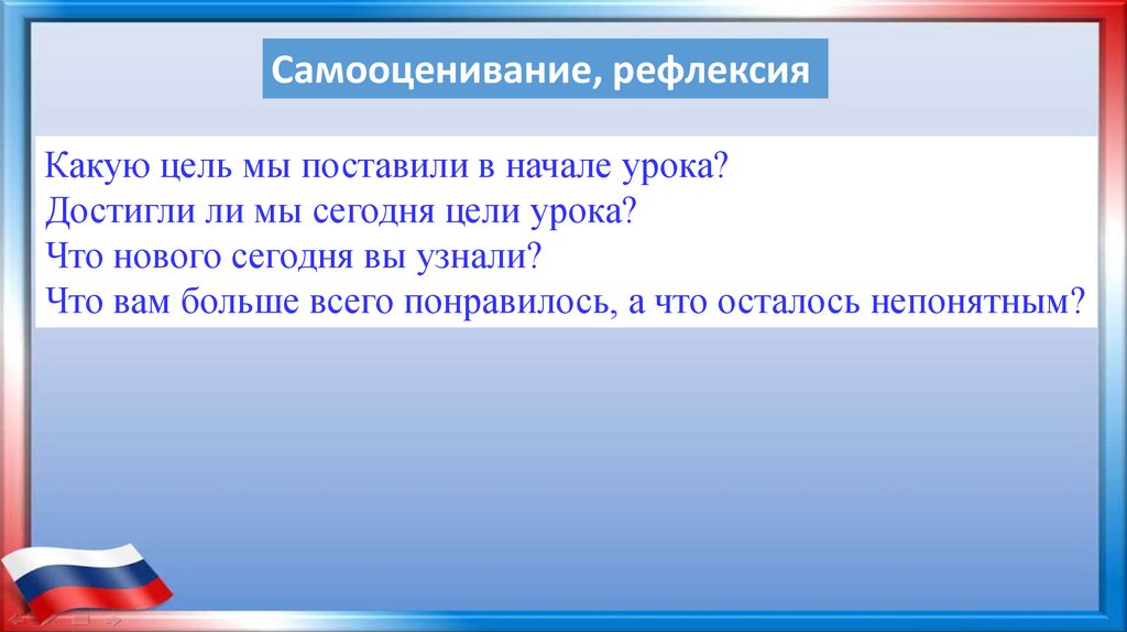 Самооценивание, рефлексияКакую цель мы поставили в начале урока?
