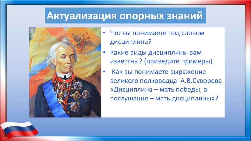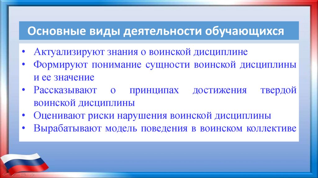 Основные виды деятельности обучающихся• Актуализируют знания о воинской дисциплине