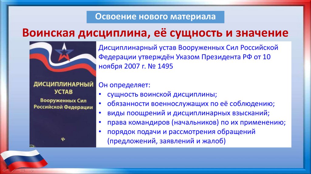 Освоение нового материалаВоинская дисциплина, её сущность и значение