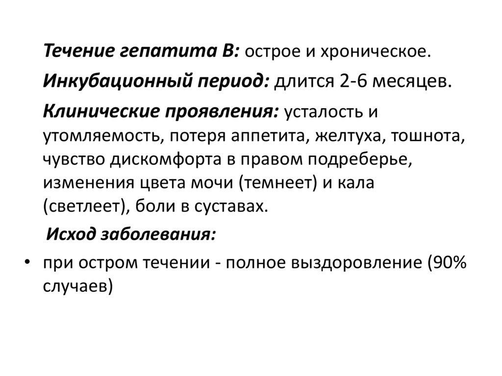 Течение гепатита В: острое и хроническое.Инкубационный период: длится 2-6 месяцев.