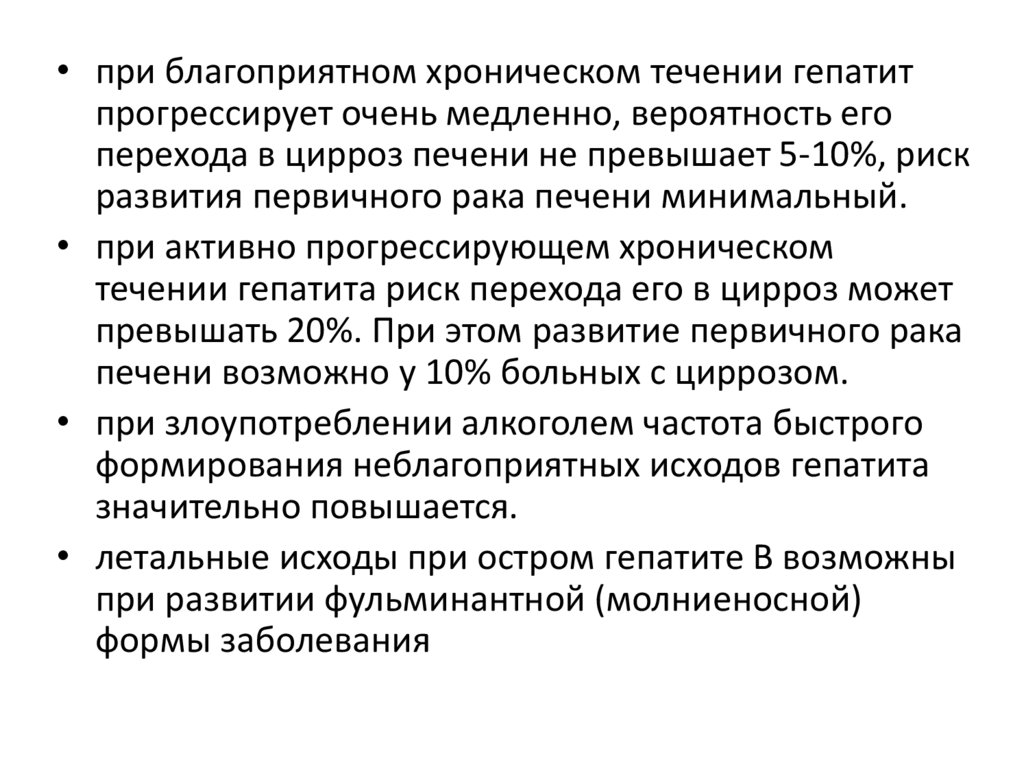 • при благоприятном хроническом течении гепатитпрогрессирует очень медленно, вероятность его