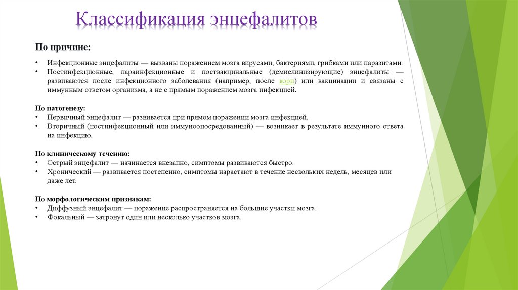 Инфекционные энцефалиты — вызваны поражением мозга вирусами, бактериями, грибками или паразитами.