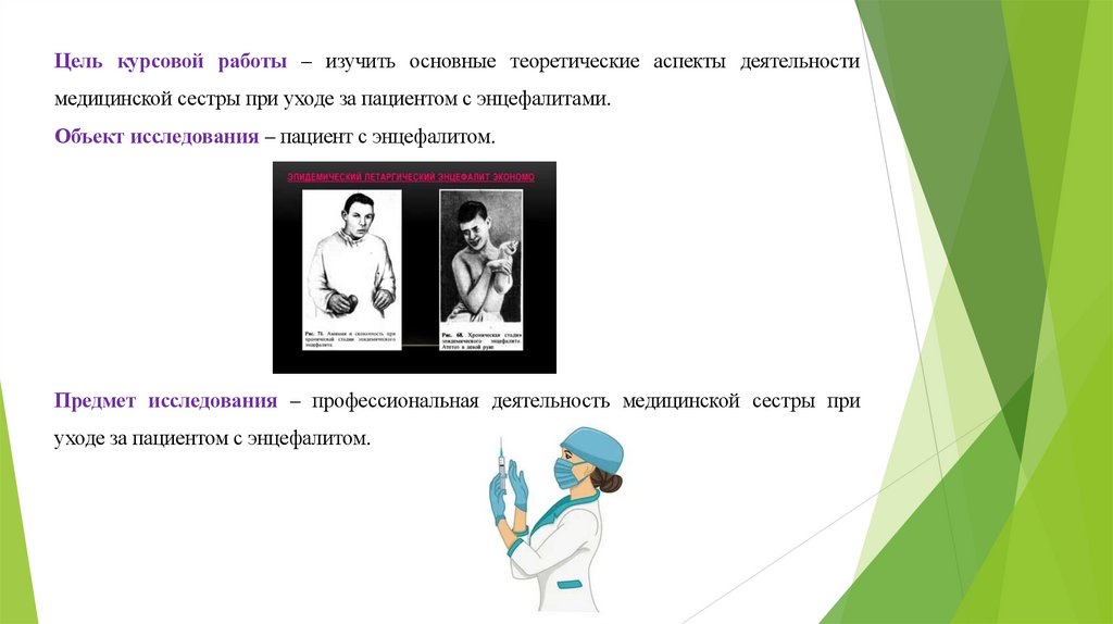 Цель курсовой работы – изучить основные теоретические аспекты деятельностимедицинской сестры при уходе за пациентом с энцефалитами.