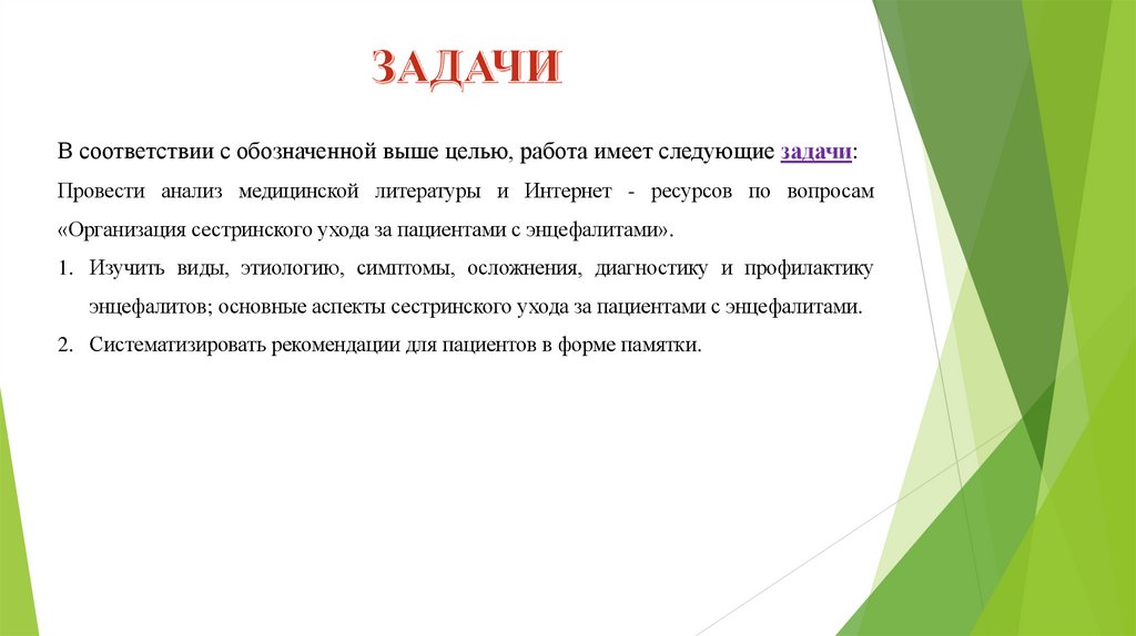 В соответствии с обозначенной выше целью, работа имеет следующие задачи:Провести анализ медицинской литературы и Интернет - ресурсов по вопросам