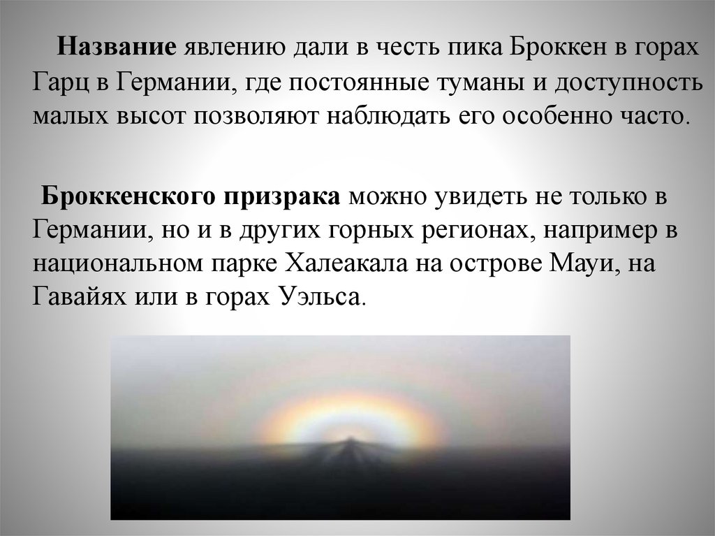 Название явлению дали в честь пика Броккен в горахГарц в Германии, где постоянные туманы и доступность