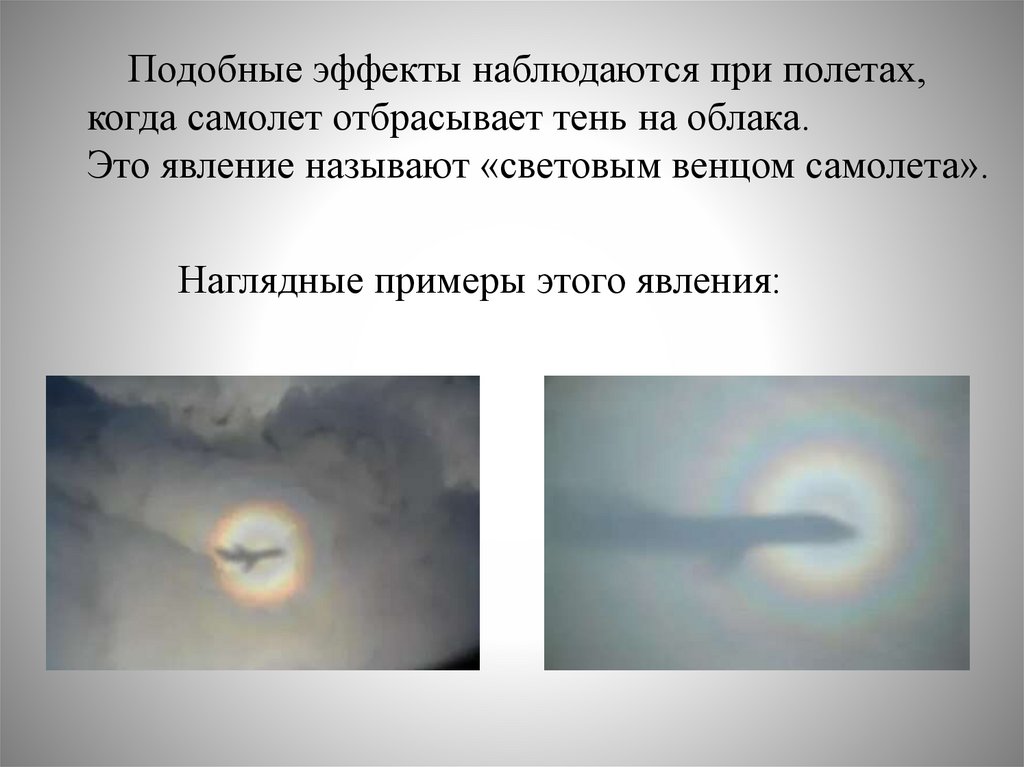 Подобные эффекты наблюдаются при полетах,когда самолет отбрасывает тень на облака.