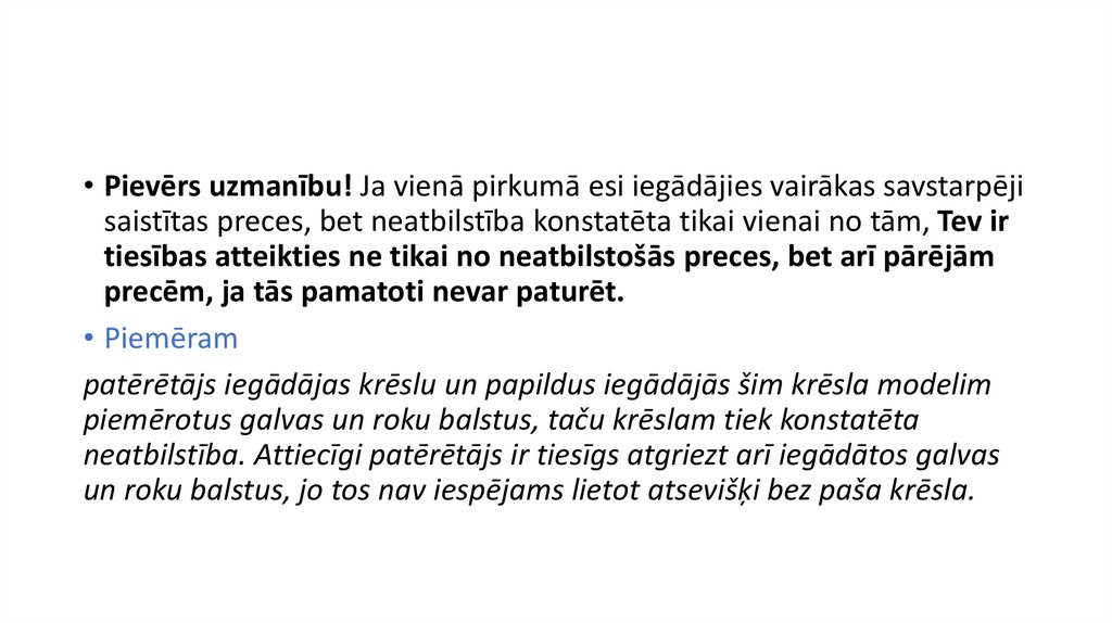 • Pievērs uzmanību! Ja vienā pirkumā esi iegādājies vairākas savstarpējisaistītas preces, bet neatbilstība konstatēta tikai vienai no tām, Tev ir