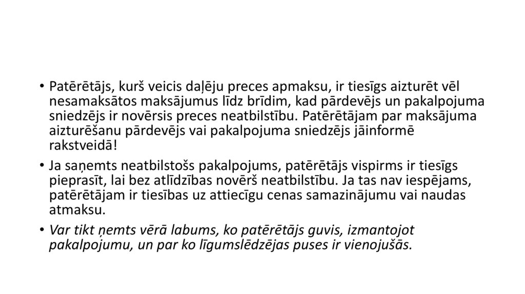 • Patērētājs, kurš veicis daļēju preces apmaksu, ir tiesīgs aizturēt vēlnesamaksātos maksājumus līdz brīdim, kad pārdevējs un pakalpojuma