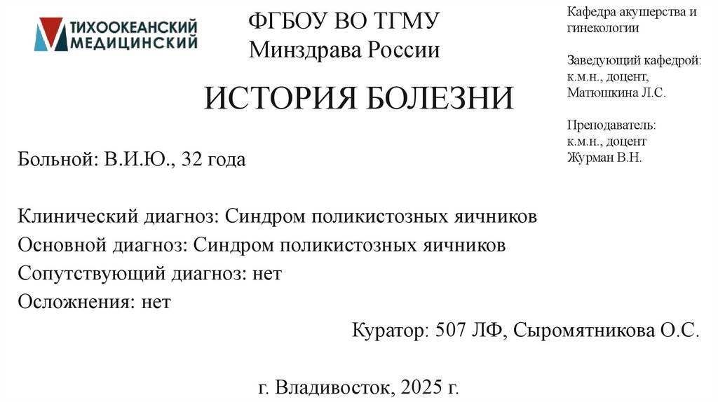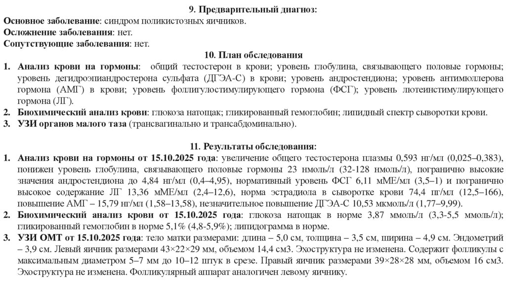 9. Предварительный диагноз:Основное заболевание: синдром поликистозных яичников.