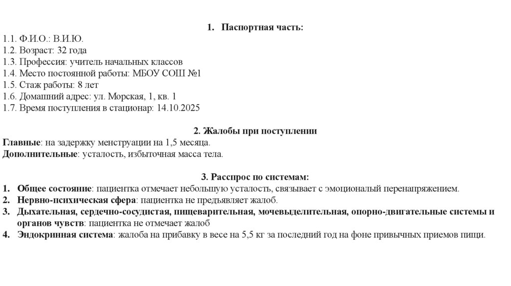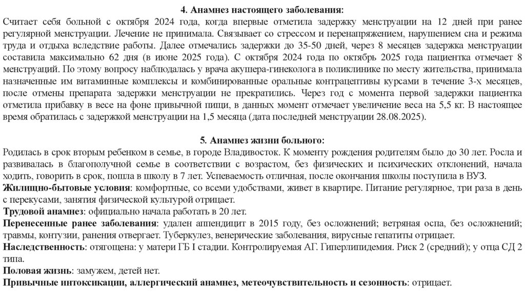 4. Анамнез настоящего заболевания:Считает себя больной с октября 2024 года, когда впервые отметила задержку менструации на 12 дней при ранее