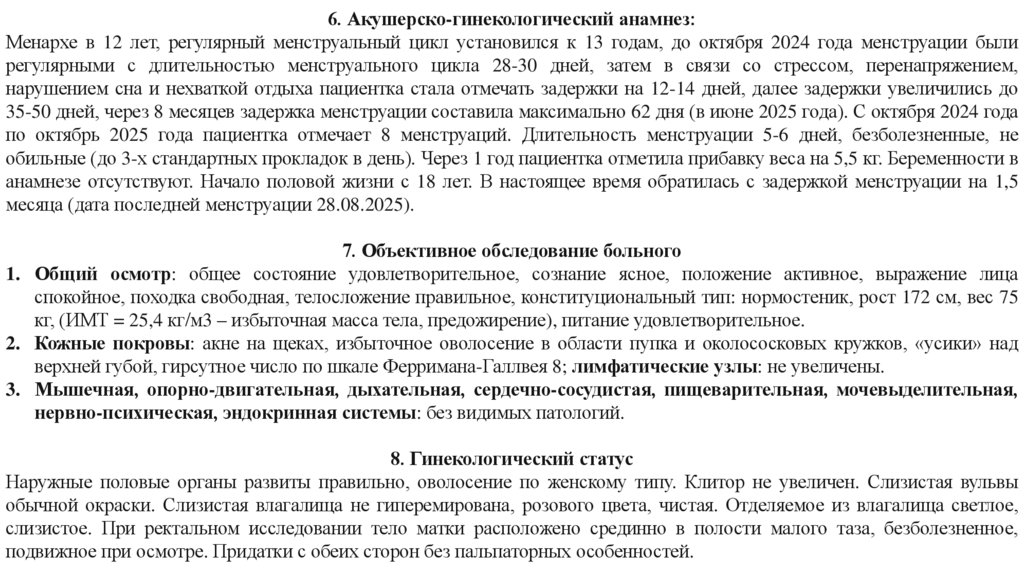 6. Акушерско-гинекологический анамнез:Менархе в 12 лет, регулярный менструальный цикл установился к 13 годам, до октября 2024 года менструации были