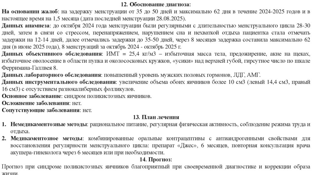 12. Обоснование диагноза:На основании жалоб: на задержку менструации от 35 до 50 дней и максимально 62 дня в течение 2024-2025 годов и в