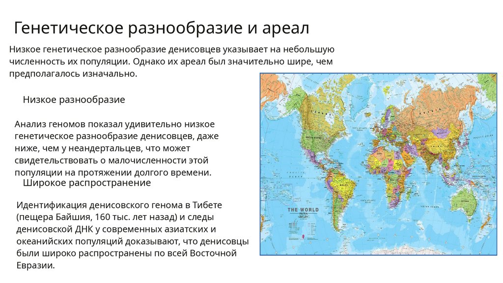 Генетическое разнообразие и ареалНизкое генетическое разнообразие денисовцев указывает на небольшую