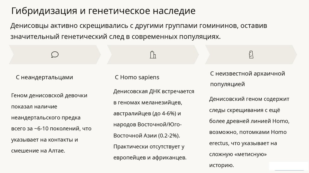 Гибридизация и генетическое наследиеДенисовцы активно скрещивались с другими группами гомининов, оставив