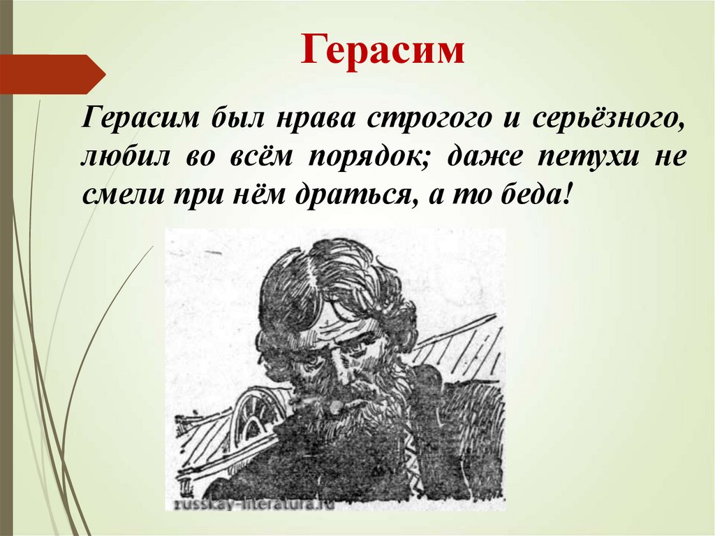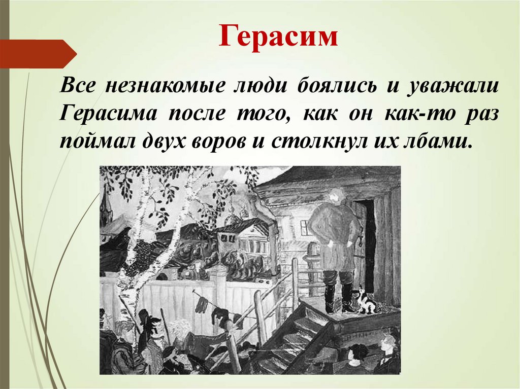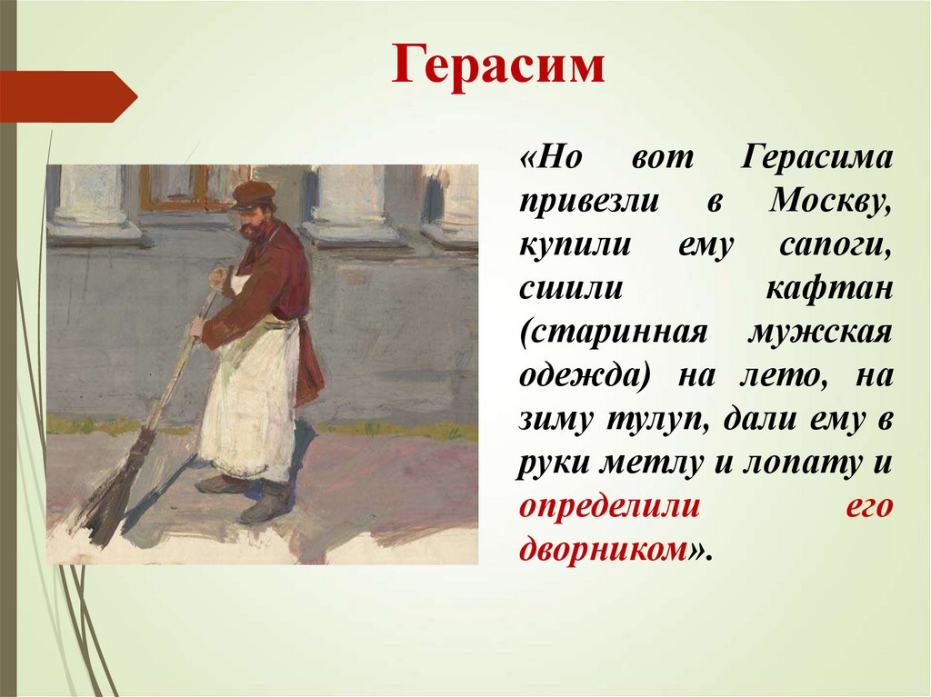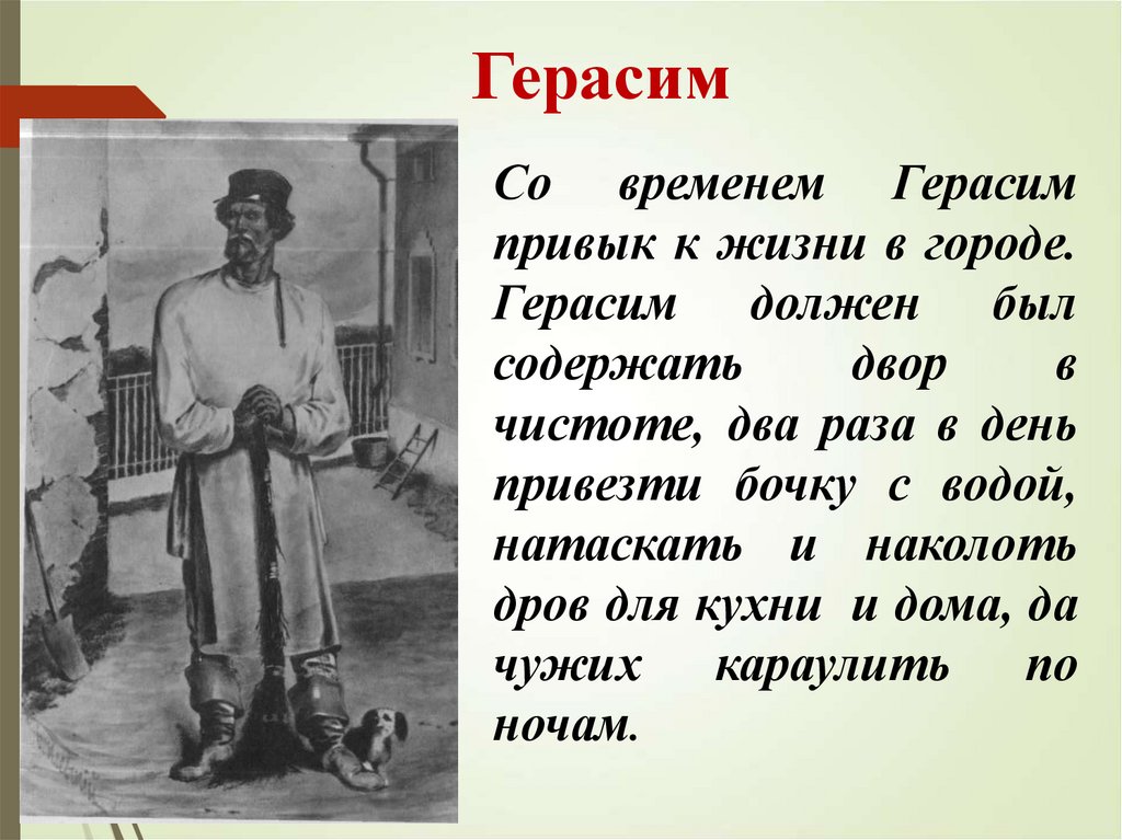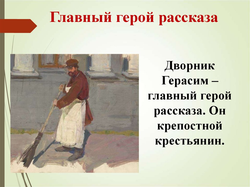 Герои рассказаГера́сим – дво́рник (работник, поддерживающий чистоту и