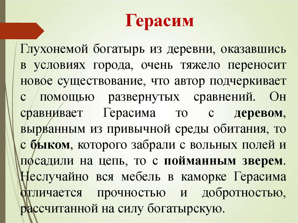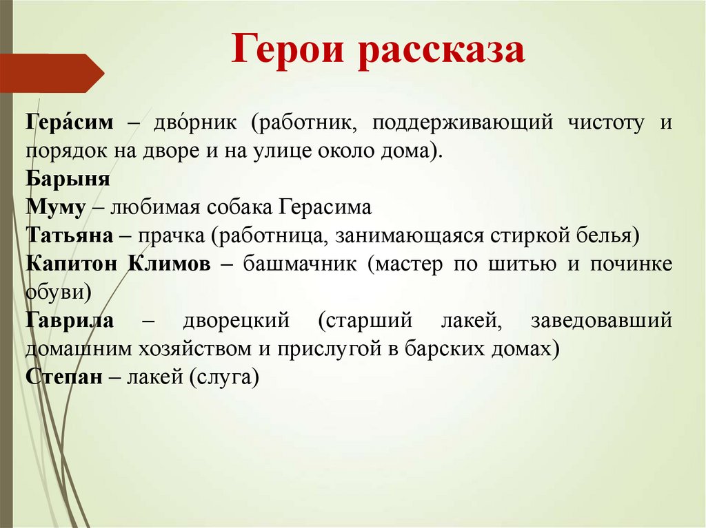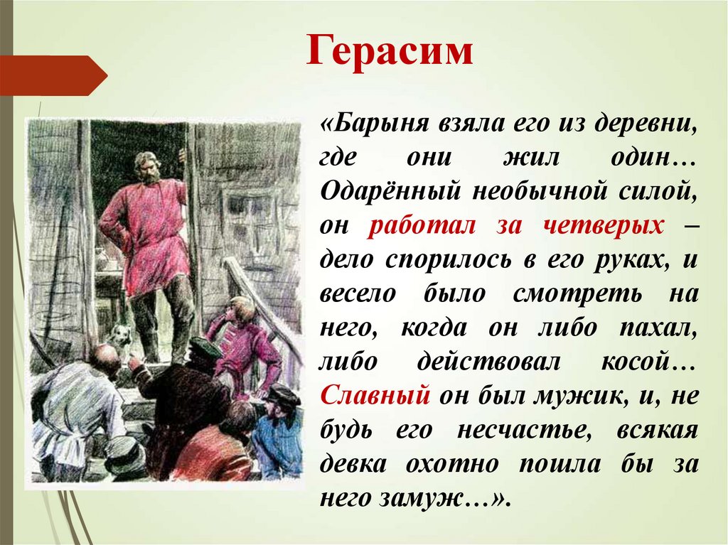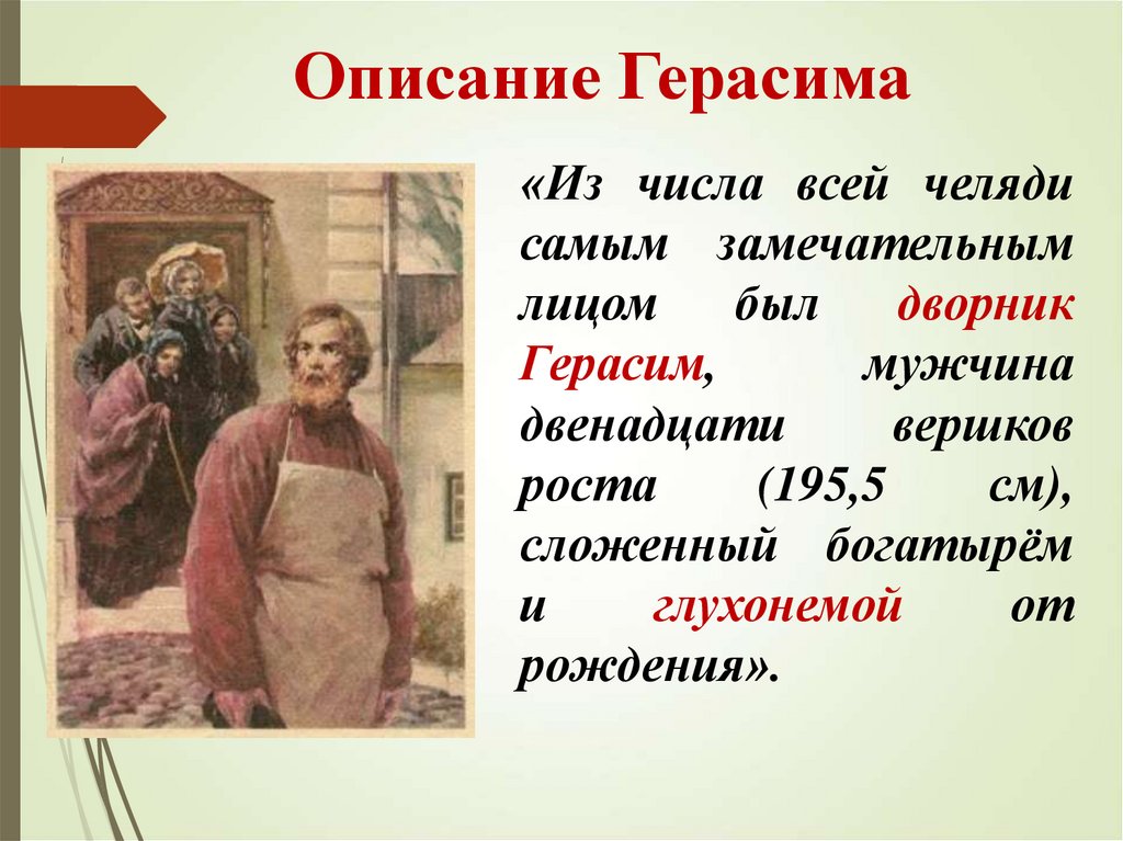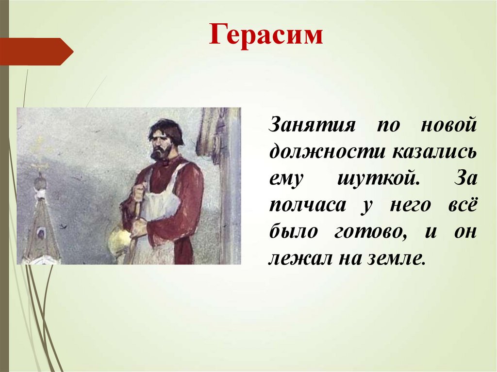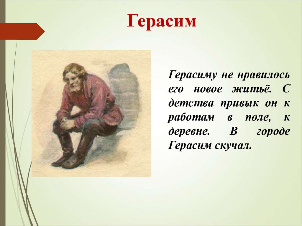 Герои рассказаГера́сим – дво́рник (работник, поддерживающий чистоту и