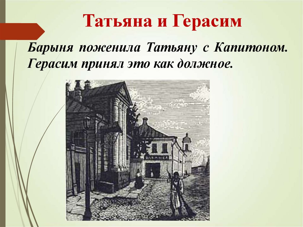 Татьяна и ГерасимБарыня поженила Татьяну с Капитоном.