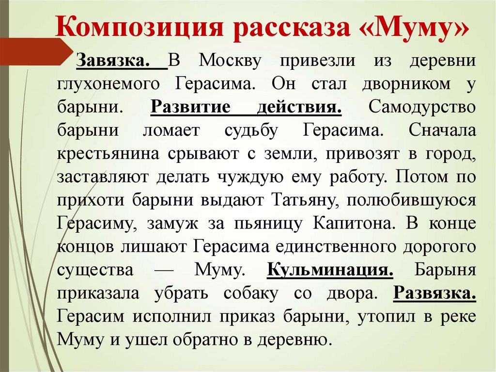 Композиция рассказа «Муму»Завязка. В Москву привезли из деревни