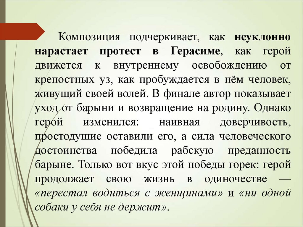 Композиция подчеркивает, как неуклоннонарастает протест в Герасиме, как герой