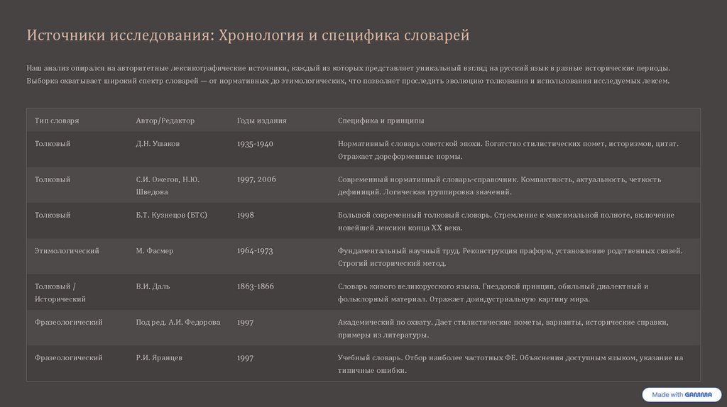 Выборка охватывает широкий спектр словарей — от нормативных до этимологических, что позволяет проследить эволюцию толкования и использования исследуемых лексем.