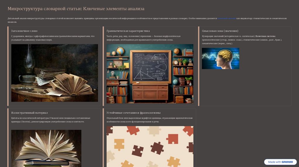 Микроструктура словарной статьи: Ключевые элементы анализаДетальный анализ микроструктуры словарных статей позволяет выявить принципы организации лексической информации и особенности ее представления в разных словарях. Особое внимание уделяется пометной системе как индикатору стилистических и семантических