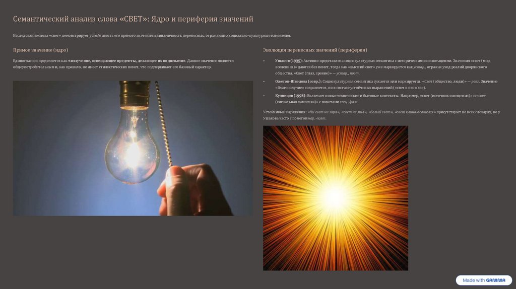 Семантический анализ слова «СВЕТ»: Ядро и периферия значенийИсследование слова «свет» демонстрирует устойчивость его прямого значения и динамичность переносных, отражающих социально-культурные изменения.
