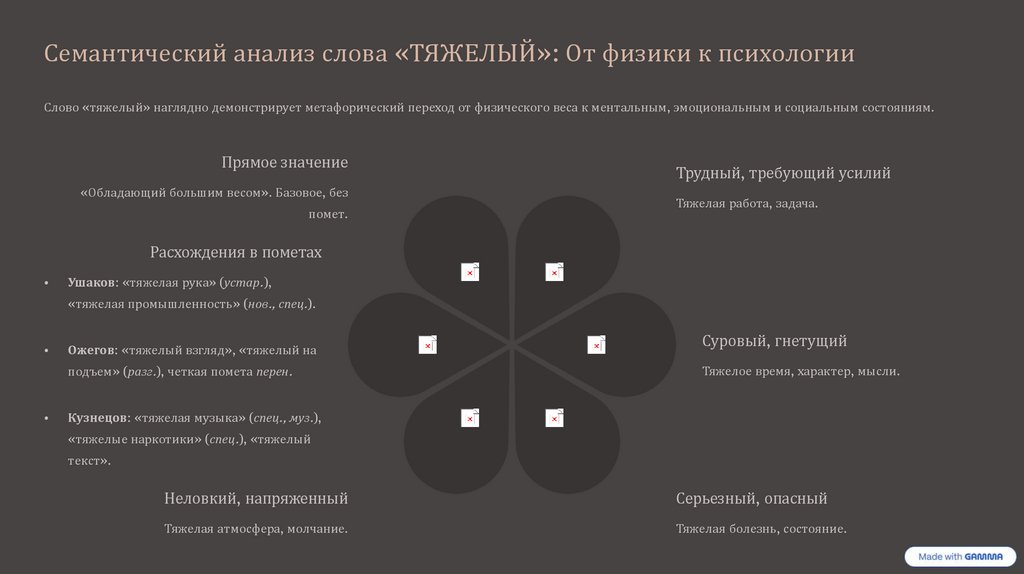 Семантический анализ слова «ТЯЖЕЛЫЙ»: От физики к психологииСлово «тяжелый» наглядно демонстрирует метафорический переход от физического веса к ментальным, эмоциональным и социальным состояниям.