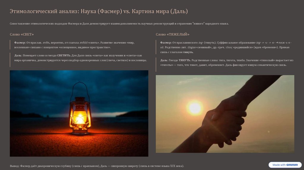 Вывод: Фасмер даёт диахроническую глубину (связь с праязыком), Даль — синхронную широту (связь в системе языка XIX века).