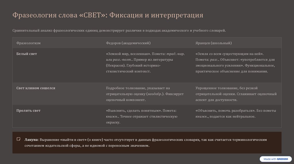 Фразеология слова «СВЕТ»: Фиксация и интерпретацияСравнительный анализ фразеологических единиц демонстрирует различия в подходах академического и учебного словарей.