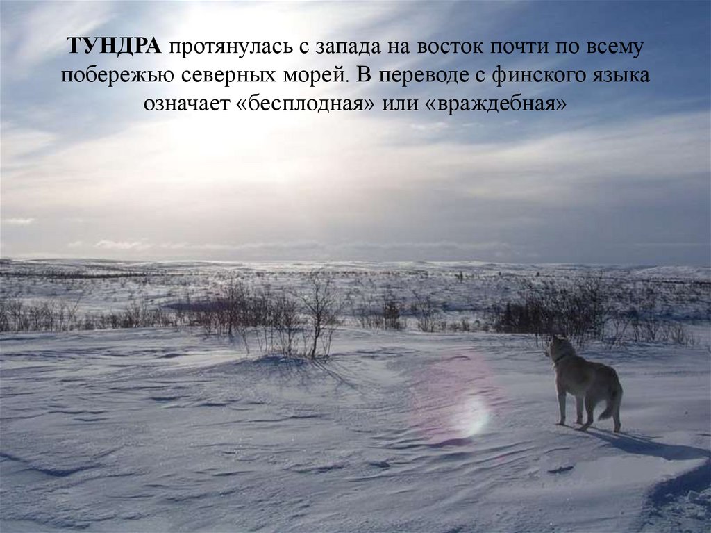 ТУНДРА протянулась с запада на восток почти по всемупобережью северных морей. В переводе с финского языка