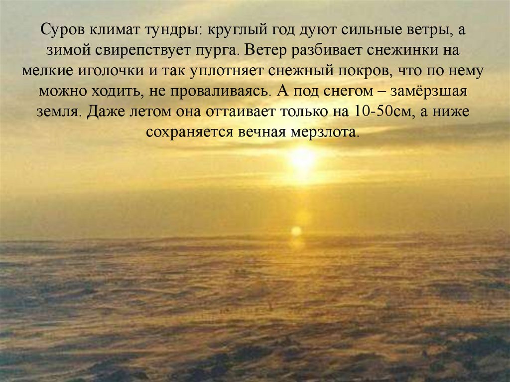 Суров климат тундры: круглый год дуют сильные ветры, азимой свирепствует пурга. Ветер разбивает снежинки на