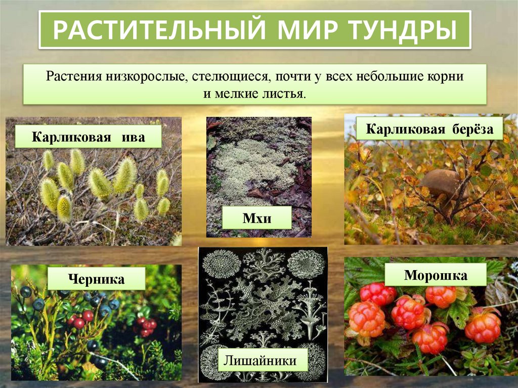 РАСТИТЕЛЬНЫЙ МИР ТУНДРЫРастения низкорослые, стелющиеся, почти у всех небольшие корни