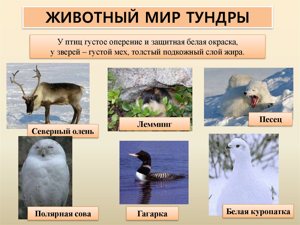 ЖИВОТНЫЙ МИР ТУНДРЫУ птиц густое оперение и защитная белая окраска,