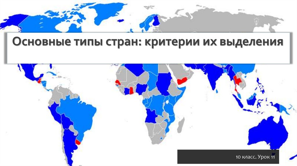 10. Исходя из уровня социально-экономического развития страны мира принято подразделять на два типа: экономически развитые страны;