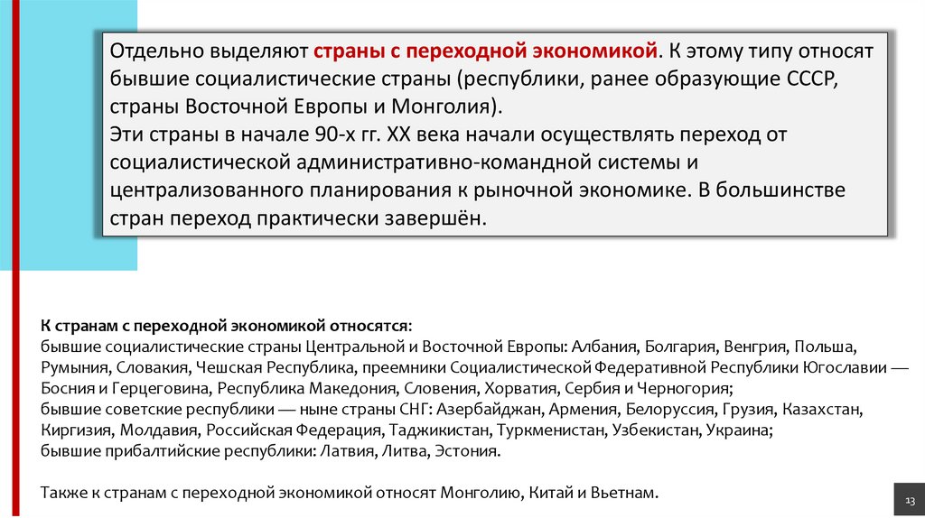 Также к странам с переходной экономикой относят Монголию, Китай и Вьетнам.